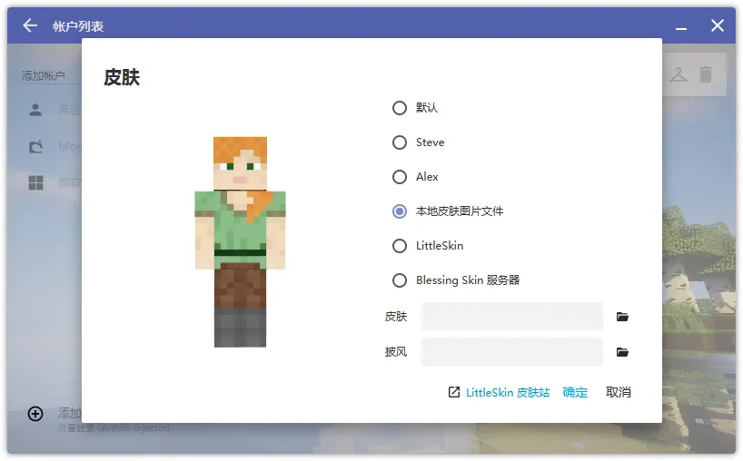 Section titled “本地皮肤图片文件”点击 本地皮肤图片文件 , 设置 皮肤/披风皮肤图片 路径, 点击 确认, 即可