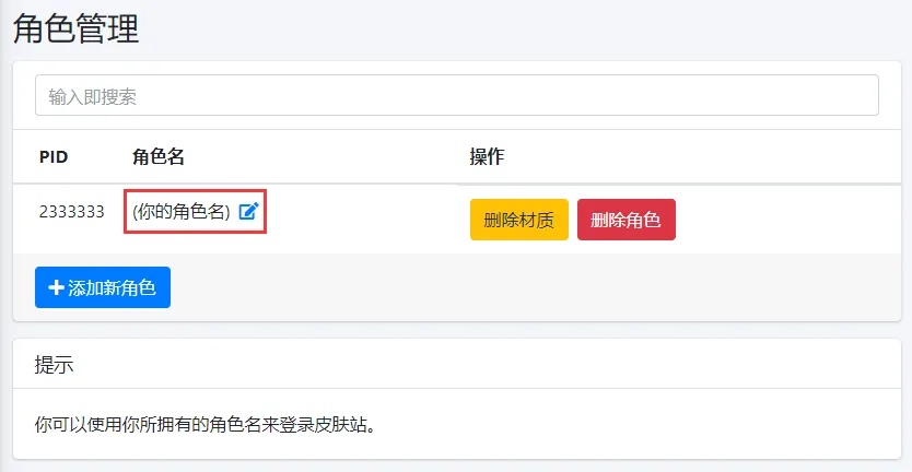 标题为“LittleSkin”的章节然后前往 角色管理, 查看您的角色名, 如果没有, 请点击 添加新角色 进行添加