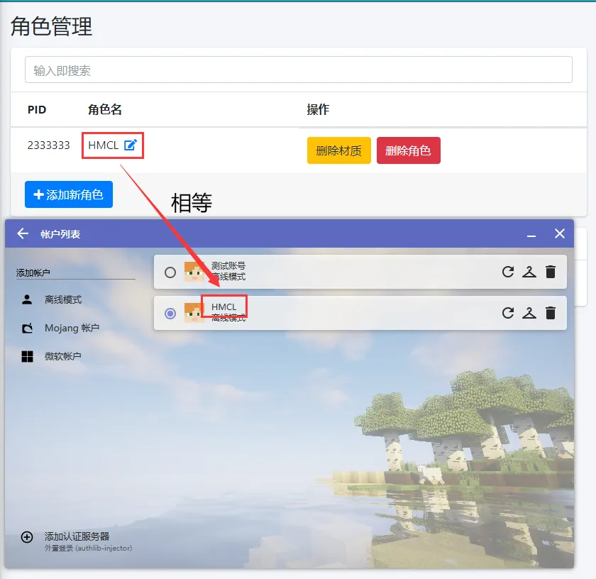 在HMCL中创建的离线账户的 账户名 必须和角色名相等, 如果不相等, 请 重新在HMCL中创建离线账户