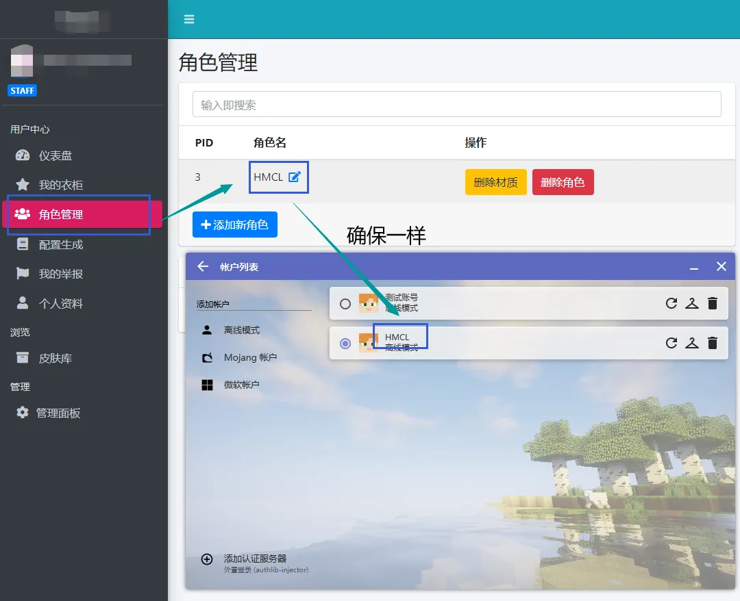 标题为“Blessing Skin 服务器”的章节进入角色管理查看角色名并确认角色名和HMCL中创建的离线账号角色名相同。如果不同请重新在 HMCL 中创建离线账户