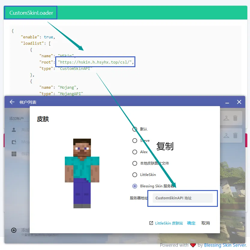 进入 配置生成, 按下图找到 CustomSkinLoader 中的网址, 复制到HMCL中即可同步在Blessing Skin 服务器上此账户名的皮肤