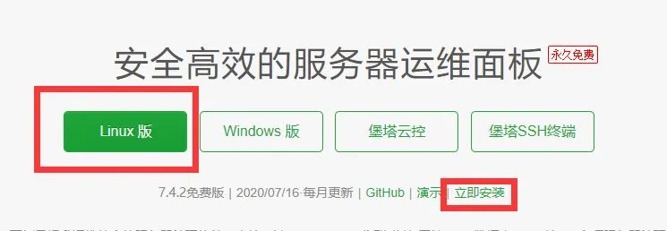 不要慌,冷静。如果下面的部分教程失效请去宝塔面板官网,点击Linux->立即安装