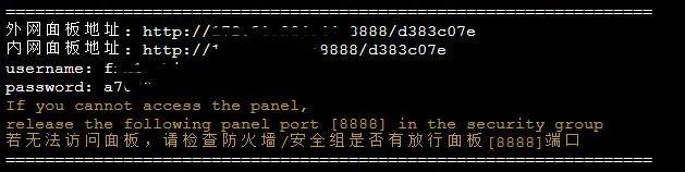 复制外网面板地址,在打开的页面中,用户名输入username后面的内容,密码输入password后面的内容,点击登入,到此为止面板按照完成 -