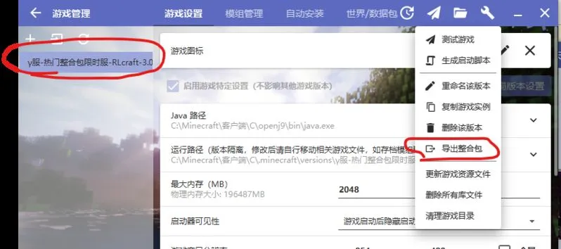 选择你的游戏版本,点击导出整合包