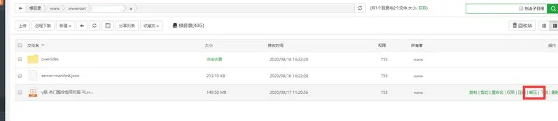 在新建的文件夹里上传刚刚导出的整合包,并解压;成功后如下图